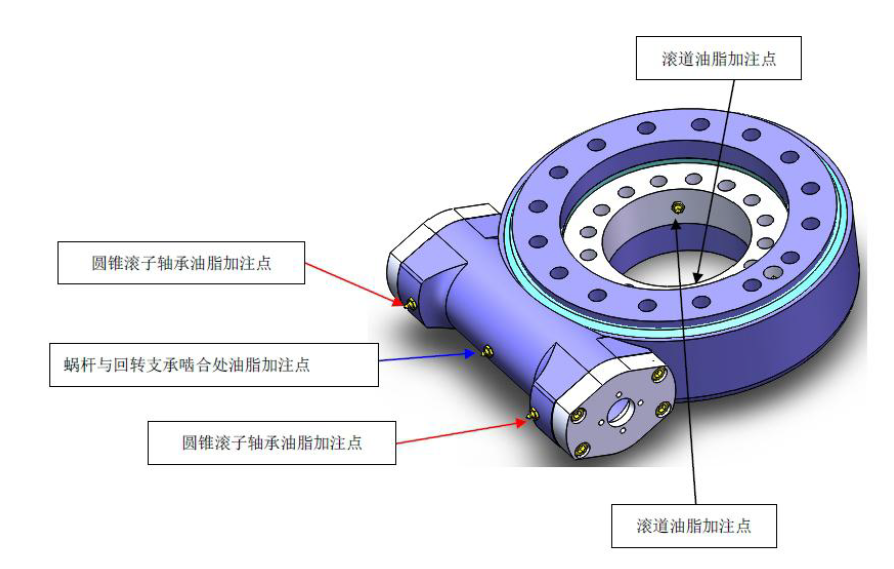 回轉支承嚙合處使用前需要重新加注潤滑脂。